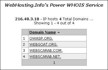 The following example shows the result of a query to one of the above reverse-IP services to 216.48.3.18, the IP address of www.owasp.org. Three additional non-obvious symbolic names mapping to the same address have been revealed.