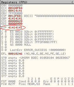 As shown in the registers window of the debugger, the EIP or Extended Instruction Pointer, which points to the next instruction to be executed, contains the value 41414141. 41 is a hexadecimal representation for the character A and therefore the string AAAA translates to 41414141.